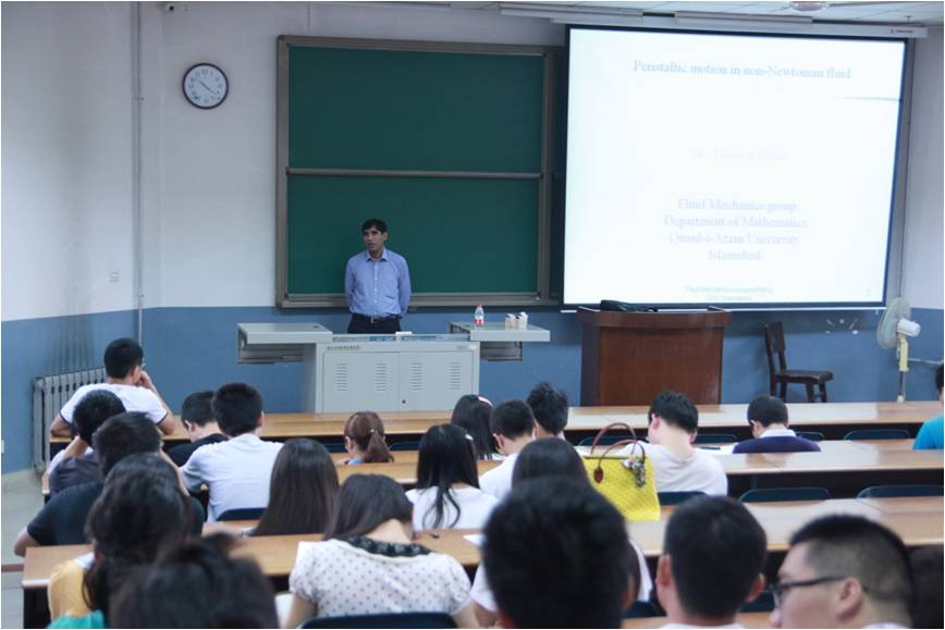 9月5日上午, Hayat教授在北校区阶梯教室J-508为公司师生做了题为“Peristaltic Motion of a Magnetohydrodynamic Generalized Second-Order Fluid in an Asymmetric Channel”的精彩报告,304永利集团唯一150余名师生参加了报告会。