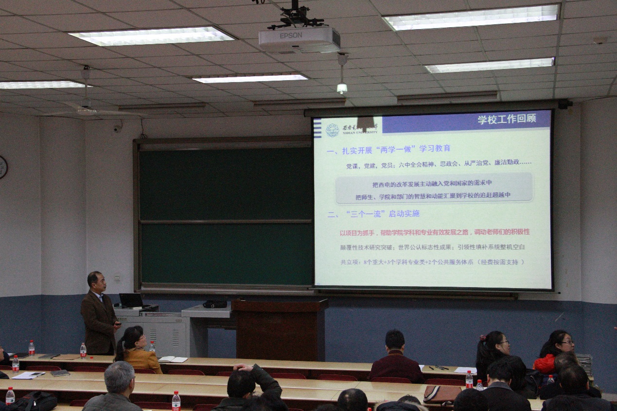 随后,仇原鹰回顾总结了2016年度公司各项工作取得的成绩,通过详实的数据分析对比,指出了公司目前存在的主要问题,并提出了相应的对策,安排部署了2017年公司重点工作:一是深入学习贯彻落实全国高校思政会和十八届六中全会精神,着力做好党建和师生思想政治工作;二是大力推进一流团队建设工作;三是扎实做好本科教学审核评估工作;四是积极推进工程教育专业认证工作;五是全力做好研究生学位授权点增列工作;六是完成新一轮岗位聘任,重点做好高层次人才队伍引育工作;七是积极配合公司办好“互联网+”大赛;八是进一步加强公司文化建设。