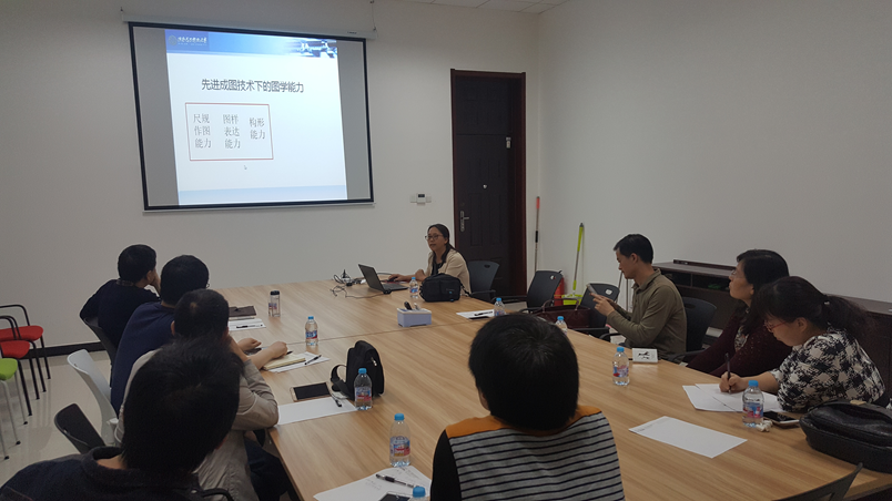 之后,杜淑幸老师作了题为“先进成图技术下提升图样表达能力”的报告。报告明确了先进成图技术下图样表达能力的内涵,指出了在数字化设计与制造发展的新形势下,图学教育必须朝着提高“图学能力”转变,即重点提高设计思维表达(轴测图)、图样表达(视图、尺寸标注、技术要求、草图等)的能力。在此基础上,根据不同专业的学时学分及图样表达能力要求,讨论并分别制定了相适应的培养目标、开展模式和评价机制。与会教师围绕该议题展开热烈的讨论,分享自己在教学中的经验,提出当前教学过程中遇到的实际问题,表示要齐心协力,积极开展先进成图技术下图样表达能力的教学实践,取长补短,共同进步。