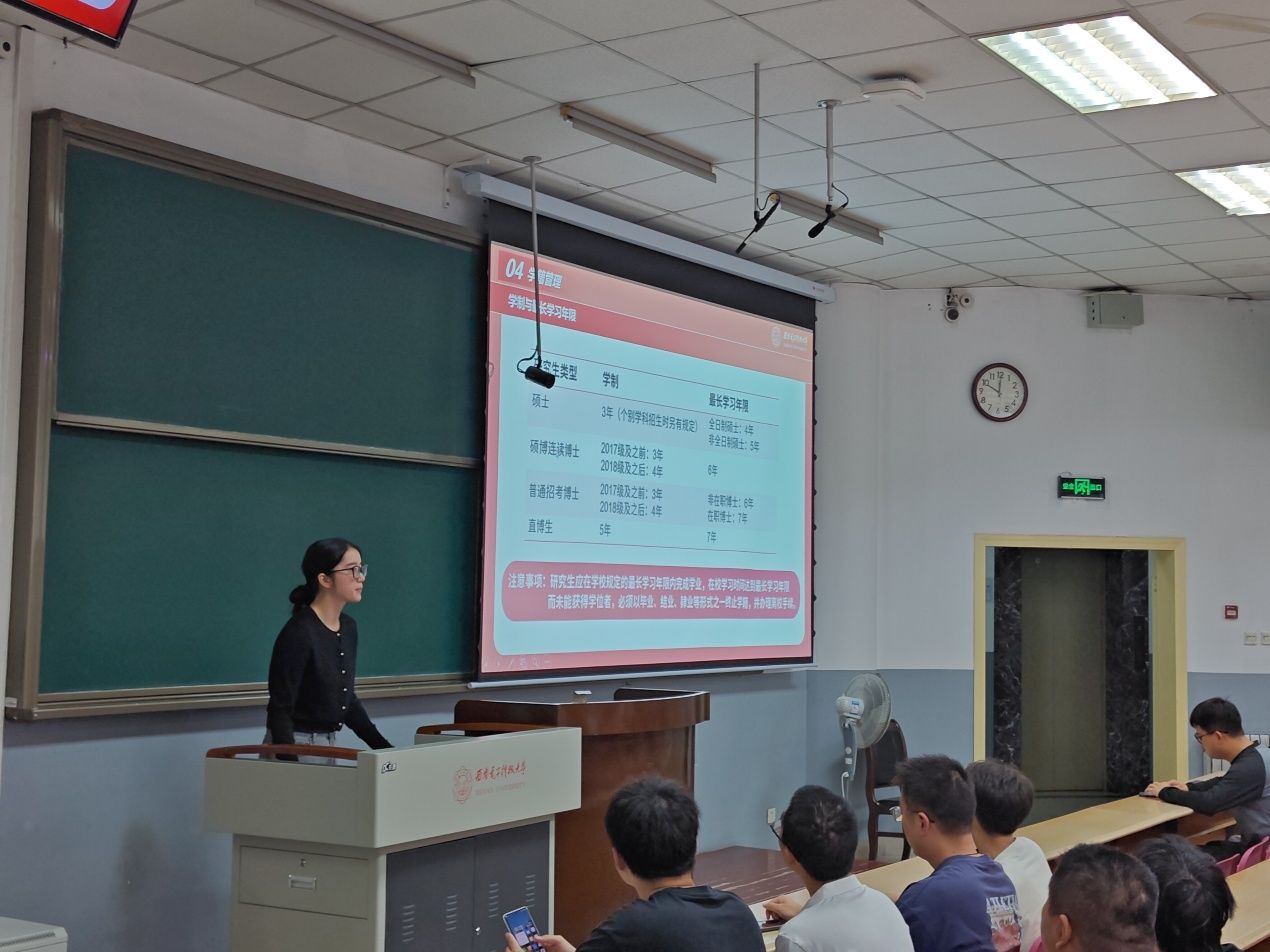 接着,研究生辅导员周蕾、刘紫薇围绕研究生日常管理、奖助体系、心理健康等13个方面为同学们开展了入学教育,通过具体案例讲解、播放消防交通安全警示教育短片等多种形式,全面地讲述了有关研究生生涯的各项事务,引导同学们遵守校规校纪,增强安全防护意识,恪守学术道德,合理规划研究生生活。