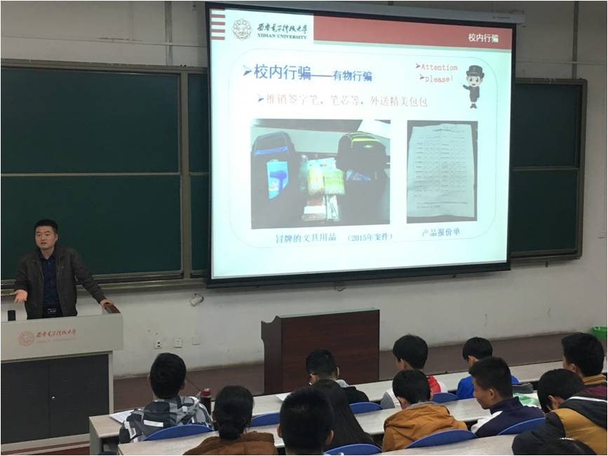 首先,魏老师从校内行骗讲起。从有物行骗——如冒充商家向员工推销冒牌签字笔、笔芯,到无物行骗——如冒充境外老员工借钱或者直接开口要钱,魏老师通过多个生动的案例给同学们讲解了各式各样的行骗手法,引发了同学们的深刻反思。