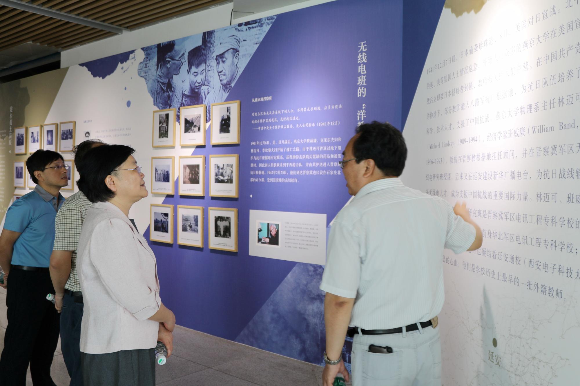 随后,在图书馆负责人等陪同讲解下,郑晓静参观了正在南校区图书馆文化长廊展出的“西电办学路上的外专外教事迹展”,对展览内容及意义给予了充分肯定。