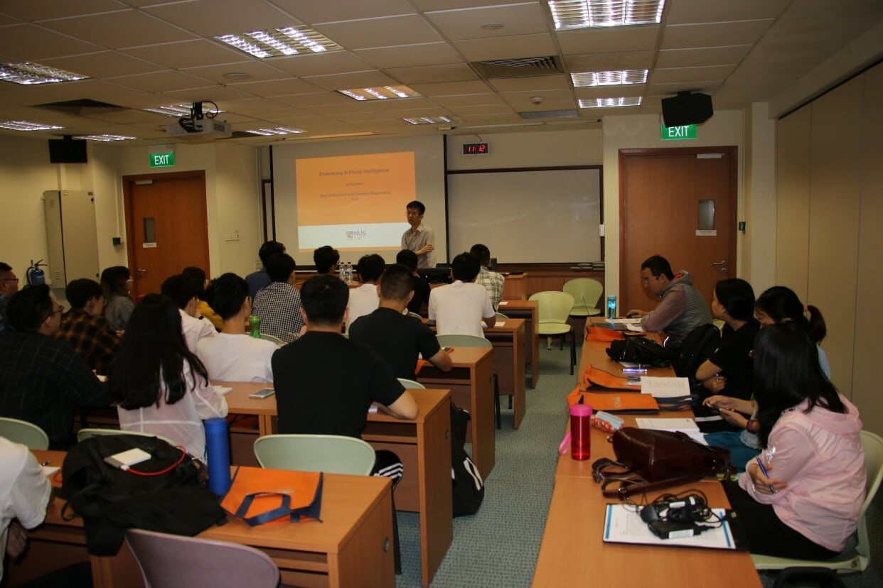 开营仪式由Zhang Rongli博士主持。张博士从活动安排、新加坡国情概况、教育体制和NUS介绍等方面向同学们做了讲解,拉开了智能机器人技术训练营的序幕,让同学对丰富的讲座和体验活动充满了期待。随后,304永利集团唯一王飞老师向NUS张老师和李海洲教授赠送西电定制礼物,双方合影留念。随后,李海洲教授以人工智能的相关背景与发展以及语音处理的相关技术为题目,为同学们做了一场精彩的报告。