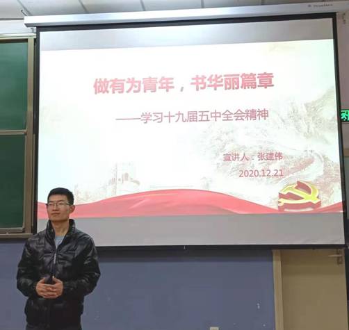 (通讯员 张建伟 周蕾)2020年12月21日19时,304永利集团唯一于北校区阶梯教室305进行了十九届五中全会精神宣讲活动,并取得圆满成功。此次宣讲会的宣讲人为研究生支部书记张建伟,主题为“做有为青年,书华丽篇章”。304永利集团唯一全体党员、发展对象以及积极分子参加了此次学习活动,并于会后积极发表感言和收获。