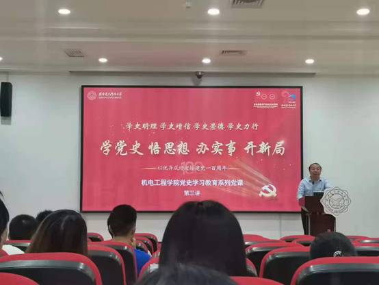 左愿远以《中国共产党的建设》为题为大家讲授了党课,分别从中国共产党的创建过程、所取得的重大成就及丰富的建设经验等角度入手,带领大家回顾了党的光荣历史。首先,他以中国共产党在不同历史时期的组织建设为切入点,介绍了在民主革命时期、国共合作时期、新中国成立后、改革开放时期等不同阶段,党的发展历程及面对的主要挑战,生动展示了中国共产党是如何在曲折中不断前进,最终带领中国人民站起来、富起来、强起来的。他说,从建党的开天辟地,到新中国成立的改天换地,历史不断证明了中国共产党和中国特色社会主义道路的正确性和必然性。