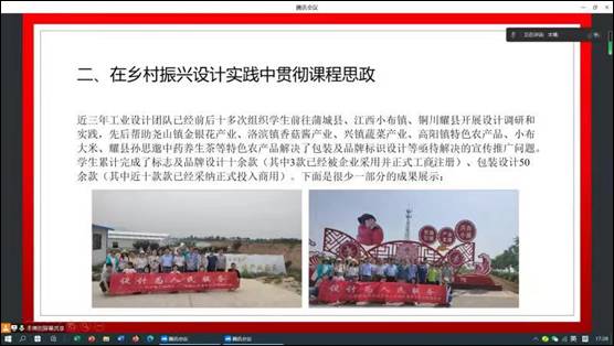 其次,他从课堂教学和乡村振兴课程实践两个方面,介绍了开展设计类专业课程思政建设的成果与经验。在课堂教学方面,结合典型思政示范建设课程《工业设计概论》的教学过程,介绍了如何利用《大师谈设计》、《加入国宝会说话》、《圆明园》、《大国工匠》、《强国工程》等一些视频资料,进行课程思政的有机融入,让同学们从中深入体会什么是真正的美、什么是工程设计思想、如何传承和发扬中华传统文化等课程思政目标。