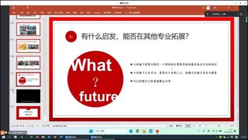 然后,丰博总结了过去几年带领员工在乡村振兴设计实践中的经验,分享了员工在实践中思想上的转变和成长,汇报了取得的丰硕成果,充分说明了在实践中贯彻课程思政的可行性和必要性。
