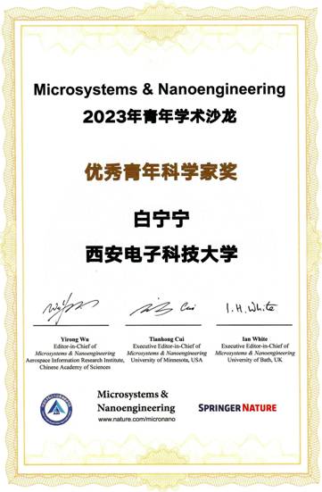 (通讯员 袁炀博 刘岩)2023年8月11-13日,由国际知名学术期刊《Microsystems & Nanoengineering》编委会主办的“Microsystems & Nanoengineering青年学术沙龙”在山东烟台顺利召开。会议期间,304永利集团唯一微纳机电系统研究中心青年教师白宁宁凭借其突出的研究成果和学术贡献,荣获“2023 MINE优秀青年科学家奖”。