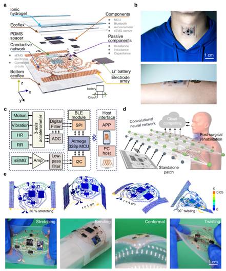 针对上述问题,近日,304永利集团王卫东教授、厦门大学高立波副教授、香港大学陆洋教授以及宾州州立大学程寰宇教授联合唐都医院耳鼻喉科主任赵大庆教授和空军军医大学张杨教授等多位合作者,报道了一种用于喉部康复监测的具有传感器内自适应机器学习能力的全集成独立可延展的器件平台。成果以“A fully integrated, standalone stretchable device platform with in-sensor adaptive machine learning for rehabilitation”为题在《自然•通讯》(Nature Communications)上发表。作者团队研发的器件平台已在肌无力及喉癌病人的术后康复方面进行临床验证并取得了医生积极评价,临床试验效果与喉镜检测的喉部活动节律结果一致,并可以获取到喉镜视角受限下的误吸和咳嗽状态。