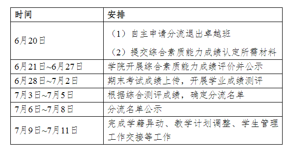卓越班在第四学期末、第六学期末分别进行一次分流,本次分流退出的员工转入卓越班所在专业的普通班学习。推免时按普通员工处理,参与普通班排名。