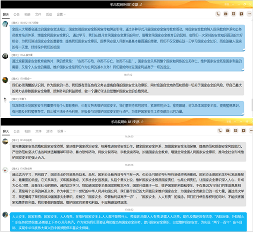 支部发展对象武彦斌也书写了自己的想法:国家安全从境内到境外,从网上到网下,既包括政治、军事等传统安全,又包括经济、文化、社会、科技、生物、网络等非传统安全问题,和我们每一个人都有很大的关系。我们作为新时代的青年,我们更要履行维护国家安全的责任和义务,时刻警惕外国间谍势力的渗入,主动维护国家安全。