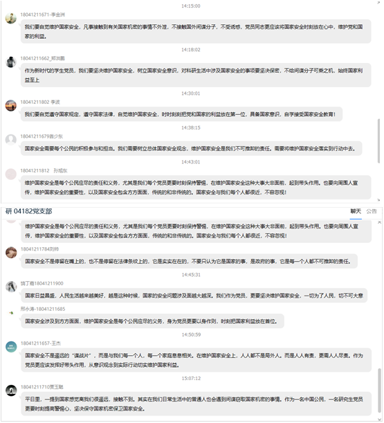 最后支部书记蔡一凡同志总结并谈论自己的想法:人人安全,国家有责;国家安全,人人有责。在维护国家安全上,人人都不是局外人、旁观者,而是人人有责,更需人人尽责。现在,疫情还没有结束,“内防反弹、外防输入”的任务仍然很重,还需要上下齐心,同舟共济。作为研究生党员我们更要正确把握当前国家安全形势,提升国家安全意识,自觉维护国家安全,为实现“两个一百年”奋斗目标、实现中华民族伟大复兴的中国梦提供牢靠安全保障。