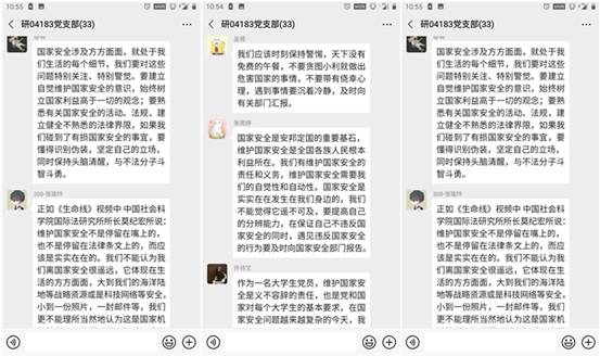 支部书记王武谈论自己的感受:国家安全对国家来说是非常重要的,作为党员更应该深谙其对我国的重要性,当国家安全受到威胁时,义无反顾的抗争是我们的义务。