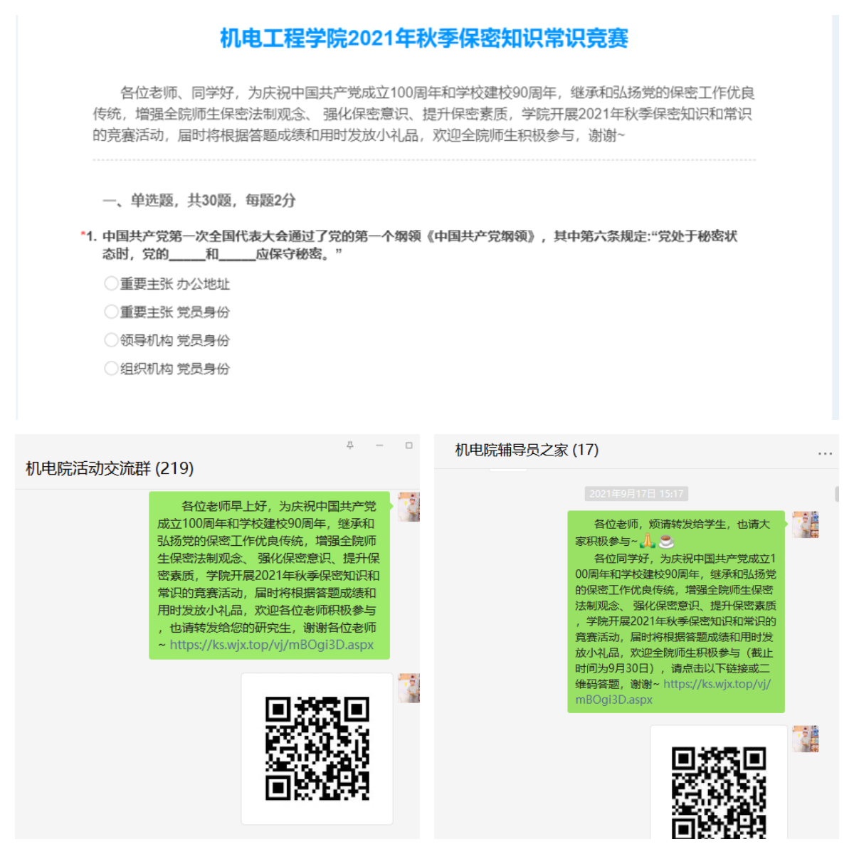 (通讯员:石贵利)为庆祝中国共产党成立100周年和公司建校90周年,继承和弘扬党的保密工作优良传统,同时激发全院师生保密知识学习兴趣,增强保密意识,营造和谐保密文化氛围,304永利集团唯一于9月中下旬开展了2021年秋季保密知识和常识竞赛答题活动,通过微信群、公司电子屏等多种方式动员全院教师和研究生积极参与。