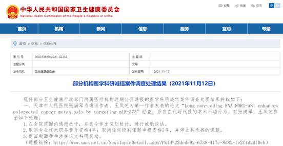 2. 2021年11月12日,国家卫健委网站公布了24起机构医学科研诚信案件调查处理结果。所涉论文主要涉及第三方代写代投、伪造实验过程、篡改研究图表等学术等不端行为,共处理78人。给予撤销研究生导团队格,取消5-8年项目申报、立项、评奖、职称晋升等活动资格等处罚。其中,福建省肿瘤医院撤销了通讯作者张晶主持的福建省自然科学基金面上项目(项目编号:2017J01263),按原渠道退回项目结余经费等处罚。