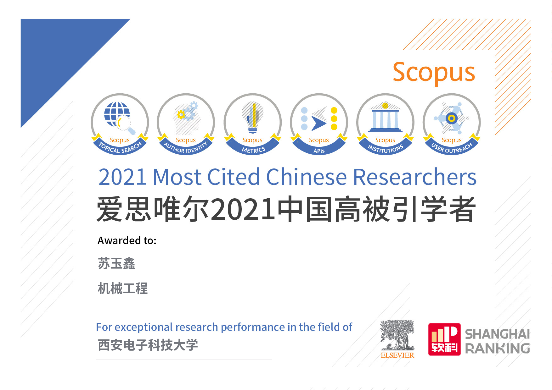 近日,全球性信息分析公司爱思唯尔(Elsevier)正式发布了2021“中国高被引学者”(Highly Cited Chinese Researchers)榜单,304永利集团唯一李志武教授入选“控制科学与工程”、苏玉鑫教授入选“机械工程”榜单,李志武教授已连续八年入选,苏玉鑫教授连续2年入选。