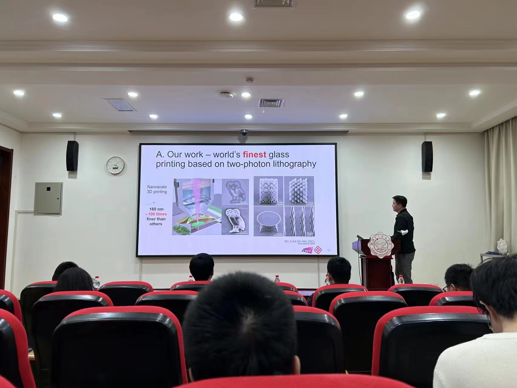 温燮文老师以石英玻璃材料的久远历史切入,以器件发展为明线、工艺技术发展为暗线,引人入胜地陈述了在增材制造与微机电系统技术推进下石英玻璃加工的科学意义与关键技术。温老师围绕超高精度玻璃增材制造的最新进展以及其在各种领域中的应用潜力,介绍了他所在实验室提出的新的研究方案及其成果。在报告中,温老师针对玻璃的高硬度、高脆性和高化学稳定性等特性,详细讲述了如何解决玻璃的复杂三维形貌结构制造和微米尺度高精度加工。针对特殊材料超高精度3D打印领域所面临的共性问题与挑战,温老师进一步讲解了基于新型双光子光刻与单光子光刻技术的研究方案,并针对高度复杂分形体结构设计与加工和专用微纳制造设备开发,分享了研发思路与实践经验。