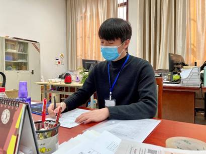 在线下,端木明星同学积极参与公司值班工作,负责疫情期间公司同学的假条审批工作,保持24小时电话畅通。针对同学们在宿舍封闭管理的问题,他坚持为同学们把假条送至宿舍楼下。为了及时解决同学们封闭管理期间的生活必需品诉求,端木明星将打印机搬至宿舍楼,协助每位有需求的同学办理必需品取送申请表。为保障核酸检测不漏一人,他坚持每天核对核酸检测信息,前往宿舍楼下监督每位同学完成核酸检测。同时,主动和值班老师一起走访实验室和员工宿舍,了解员工动态。